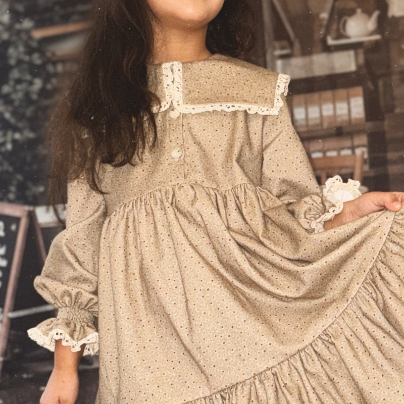 Beež puuvillane lillemustriga kleit, krae ja volangidega
