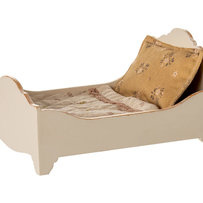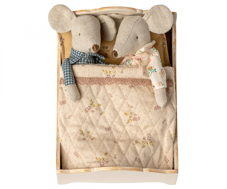 -The perfect bed for a good nights sleep. This bed has beautiful small details such as golden finish on the wood and beautiful collected fabrics for bedlinen. Two mice can easily sleep side by side as it fits big sister/brother mice.