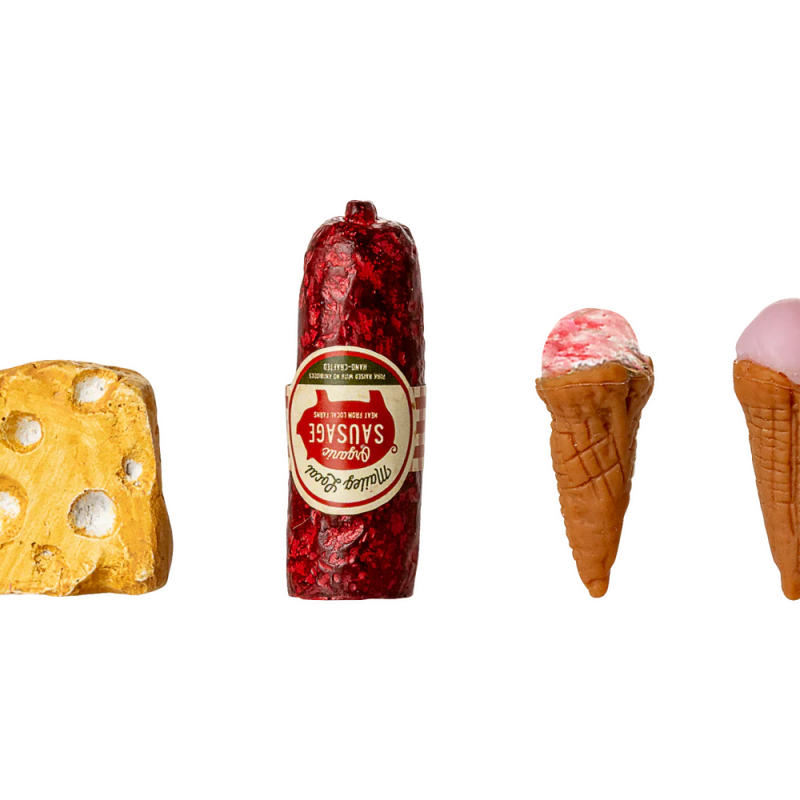-An old fashioned fridge that fits perfectly into the Maileg Mouse hole Farmhouse. Inside the fridge you will find a small cheese, sauage and some ice creams. These will extend the storytelling and play