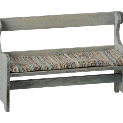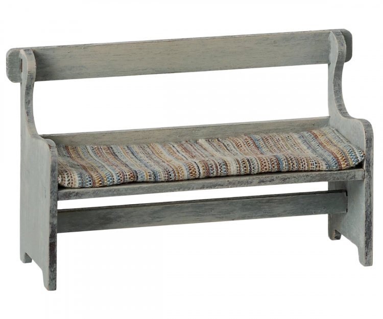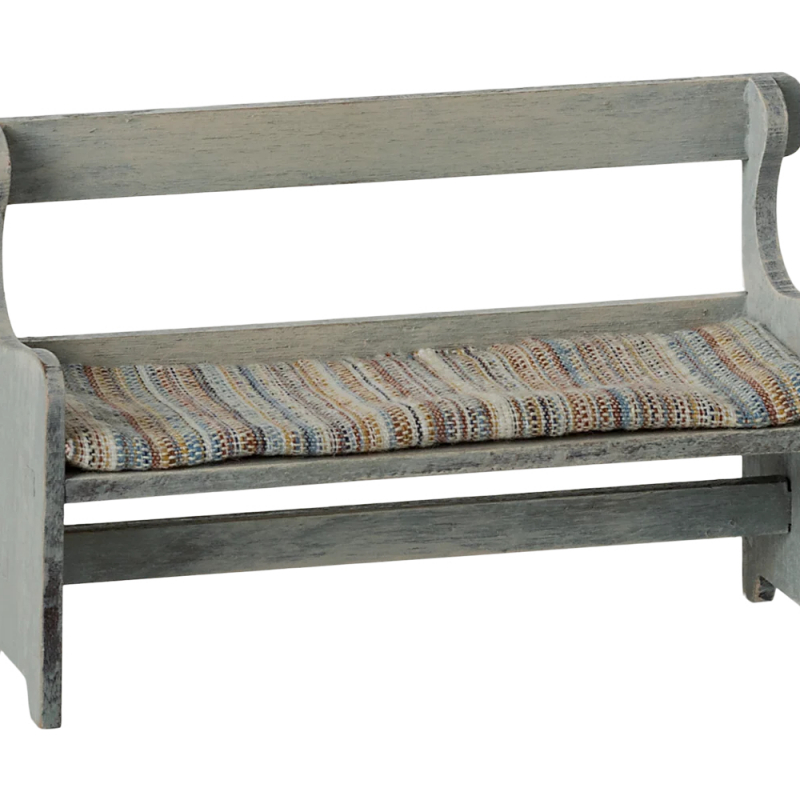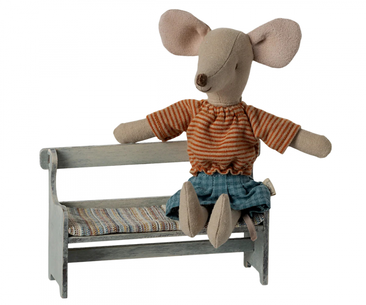 -A wooden bench made to fit the mouse family perfectly. It has a beautiful hand painted vintage look - variations may occur - and a soft cushion on top of the bench for a comfortable seat.