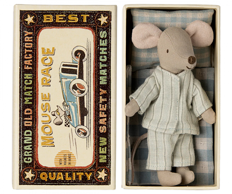 -A classic Maileg item, this mouse is ready for hours of play and sleeps soundly in its little matchbox. The clothes and bedding are made of soft fabrics with unique prints in beautiful colors. The mouse has magnets in its hands.