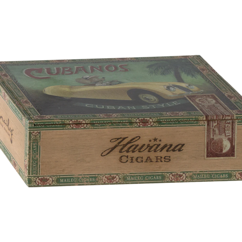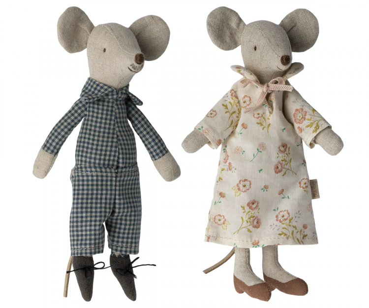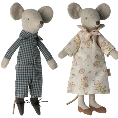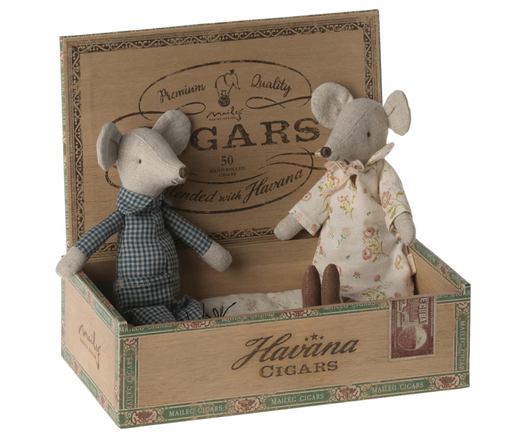 -A classic Maileg mouse item. Grandma and grandpa are wearing their nightwear and beautiful shoes. The cigar box is a perfect bed for a good night's sleep. Extend their wardrobe with sets of loose clothes to create a perfect playset