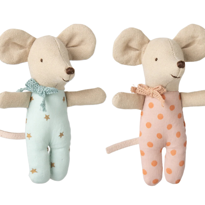 -A classic Maileg item. These baby twin mice sleep safely in their sleeping bag side by side, tucked in the matchbox bed. The mice fit all accessories in size baby mouse.
