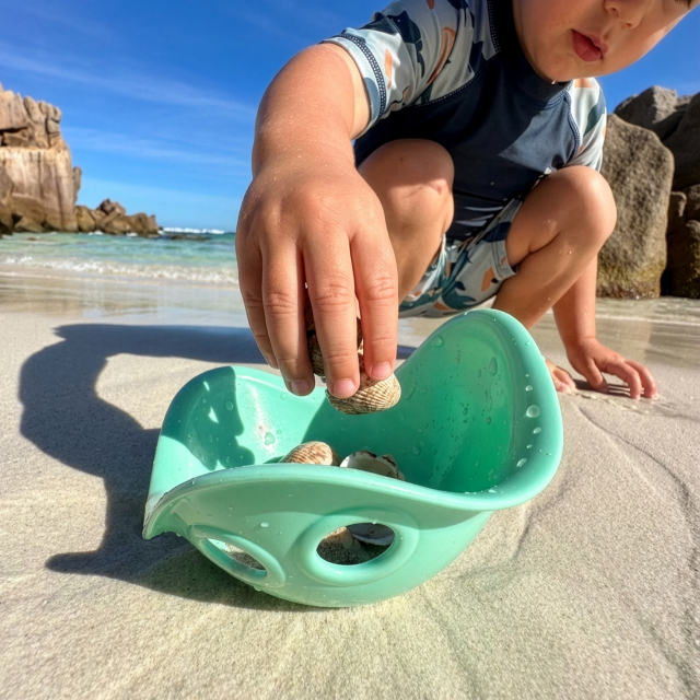 Bilibo Mini invites children to scoop, pour, float, and splash — incorporating natural elements into open-ended play. Whether in the bathtub, at the beach, or in snow, it sparks joyful exploration and hands-on learning.