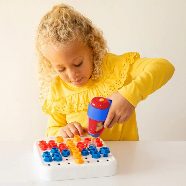 -Introduce STEM learning, including key early maths skills through fun hands-on play with this tool set for kids. While children drill and play with the colourful bolts on the sturdy activity board, they’ll be following patterns and re-creating pictures as they go. They’ll also be practising the fine motor skills they need to hold a pencil and tie their shoes.